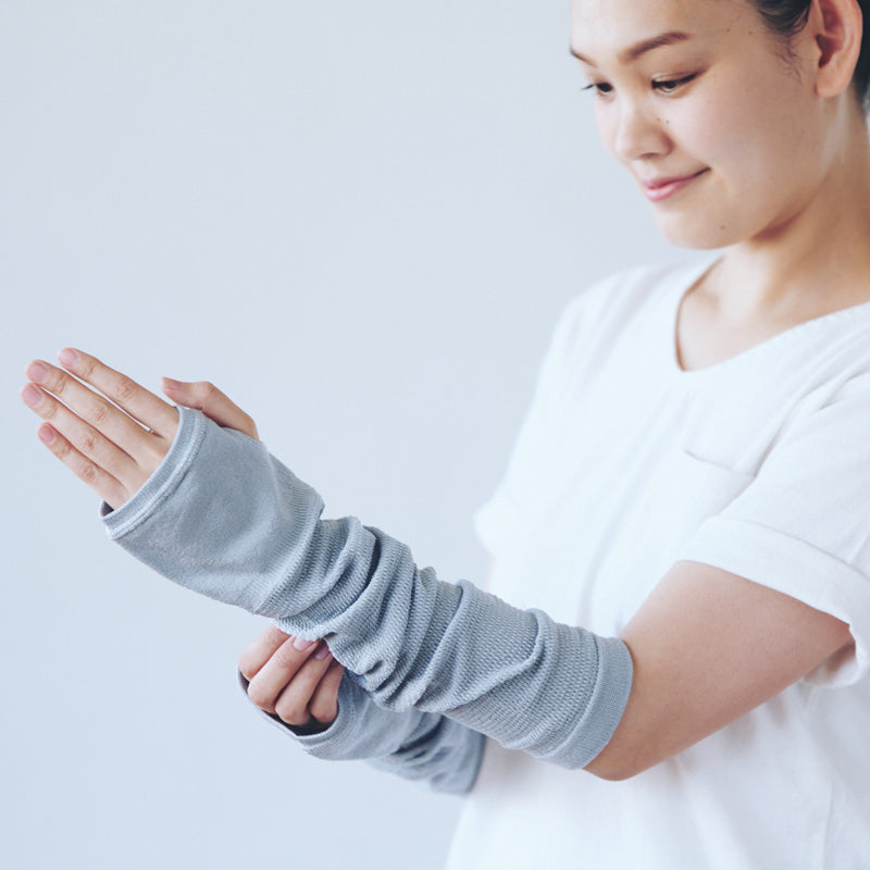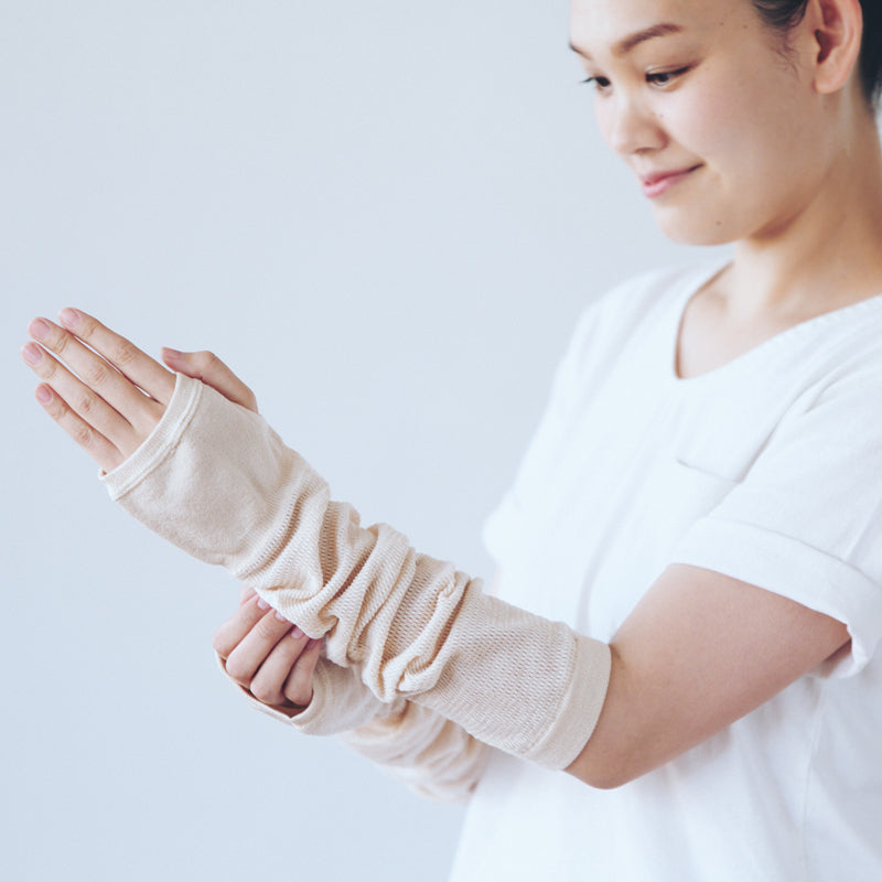 UV対策としてだけでなく、シルクならではの優れた保温性で、夏場の冷房対策、肌寒い季節にはアームウォーマーとしても活躍。空気を含んで暖かさを閉じ込めるため、季節を問わず一年中、腕まわりを優しく包み込みます。